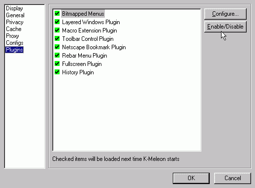 In the 'Plugins' dialog, you can control which K-Meleon-specific plugins are loaded when you start K-Meleon, and select options for some plugins.