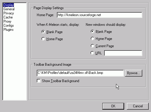 In the 'Display' dialog, you can control what is displayed when K-Meleon starts up, as well as what is displayed in any new windows you open (such as with Ctrl+N). You may also choose a background image for the toolbars, or disable the background image.